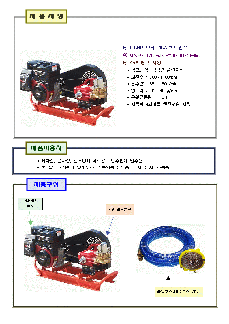 ◈ 6.5마력 엔진, 45A 헤드펌프 가반형