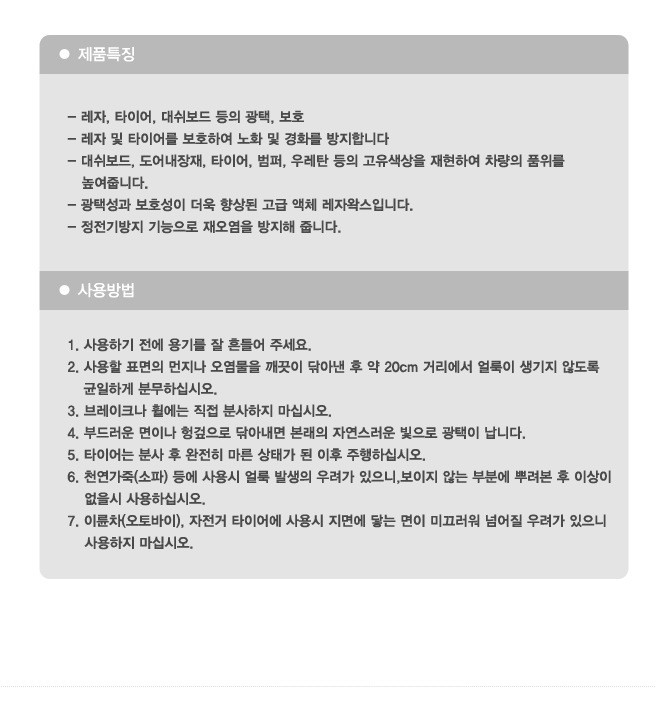 손세차장 영업용 레자, 타이어, 대쉬보드 등의 광택/보호용 왁스입니다.